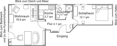 Beschreibung:•Wohnraum, möbliert mit Sitzgruppe und Schlafsofa,raumhohes Außenfenster•Schlafzimmer mit kleinem Fenster zum Hafen•separate Küche mit 4-Platten-Herd und Kühlschrank•Badezimmer mit Waschbecken, Dusche und WC