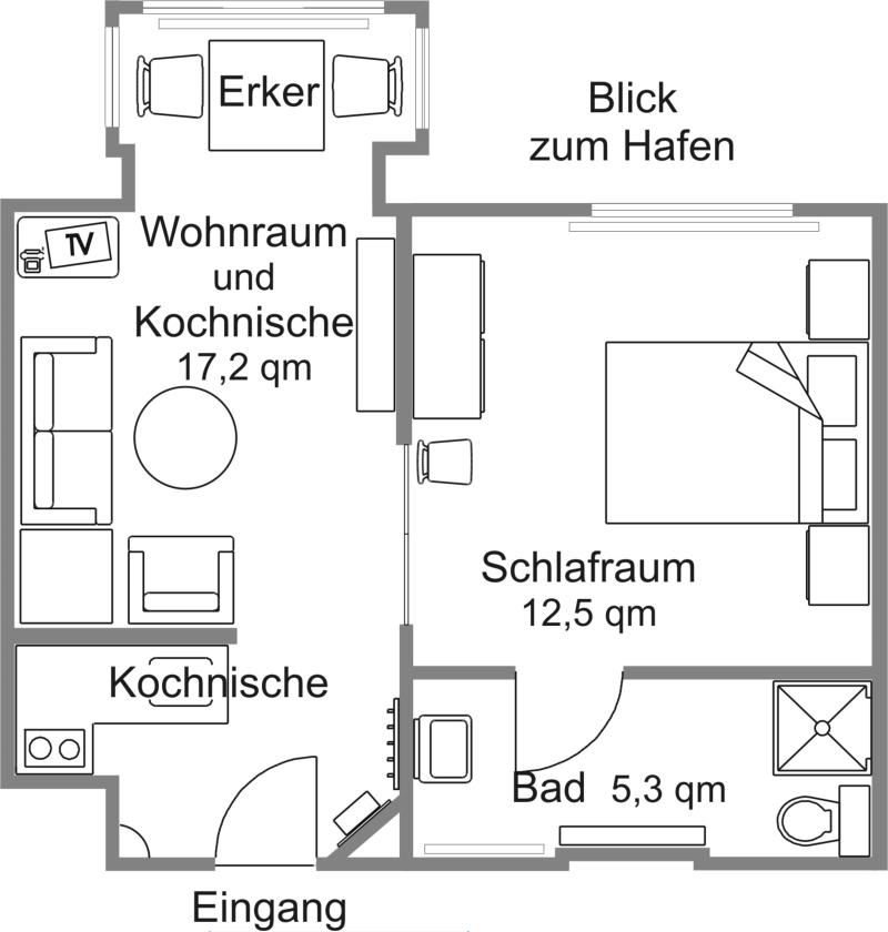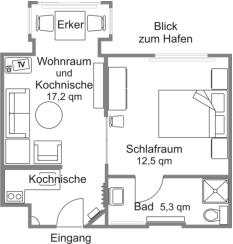 Beschreibung:•Wohnraum mit Polster-Sitzgruppe und Essplatz im Erker•Schlafzimmer mit Doppelbett•Kochnische, vom Wohnraum durch eine halb hohe Mauer abgetrennt•geräumiges Badezimmer, Dusche und WC•vom Erker sehr schöner Blick auf den Hafen