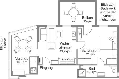 Beschreibung:•Wohn/Schlafraum mit Einzelbett, Schlafcouch und Sitzgruppe•großzügige beheizte Veranda mit Küchenzeile und Essplatz•separater Schlafraum mit Doppelbett•Badezimmer mit Dusche, Waschbecken und WC•großer Balkon nach Südwesten gelegen, auf dem Sie in windgeschützter Lage die Sonne genießen können